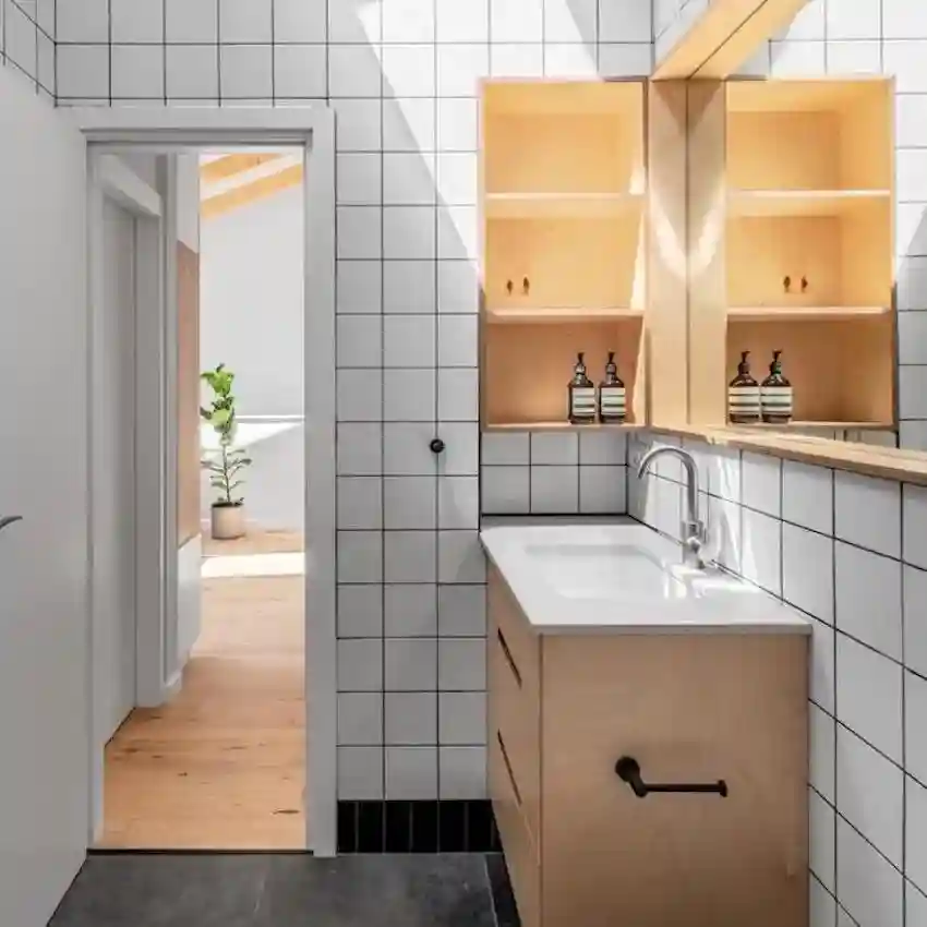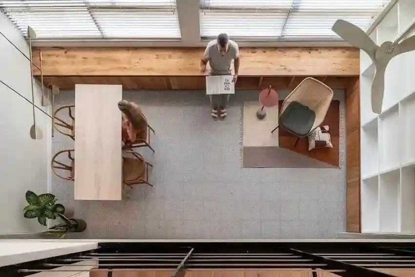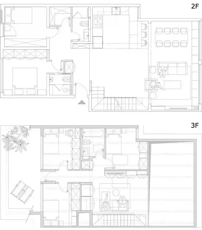 团队维持贯通社区的一楼动线,并于三楼增建斜屋顶与露台,从而拉阔屋内空间,串联室内外景致,同步运用此优势,于客餐领域带入挑空视野,并额外开设四道天窗,使住宅流淌着自然日光,亦引流更优越的通风性。
