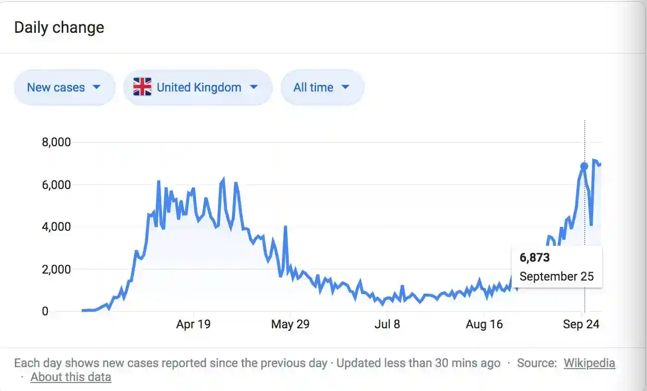 值得注意的是,英国9月25日新冠新增病例创四个月内的新高,为6873例。接下来的几天,疫情持续发酵,9月29日再创新高,新增7143例。