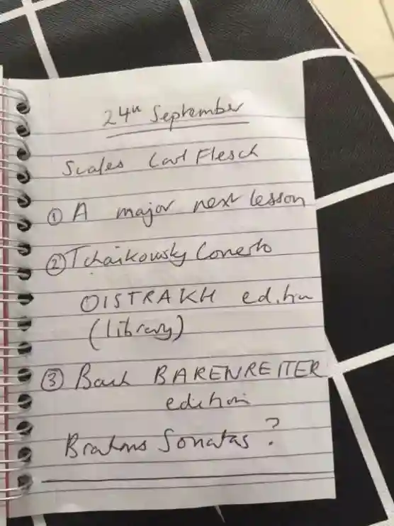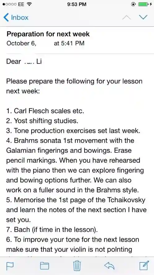 在学校的上的第一堂课,李同学本以为拉两首曲子就完事了,结果发现里已经有一群人在琴房里观摩,这是国内外教学很不同的地方,课程经常会在多人的观摩下举行,学生要习惯在人群的注视下上课。每周结束时,教授会给李同学发邮件,通知她下周课程该准备的事项: