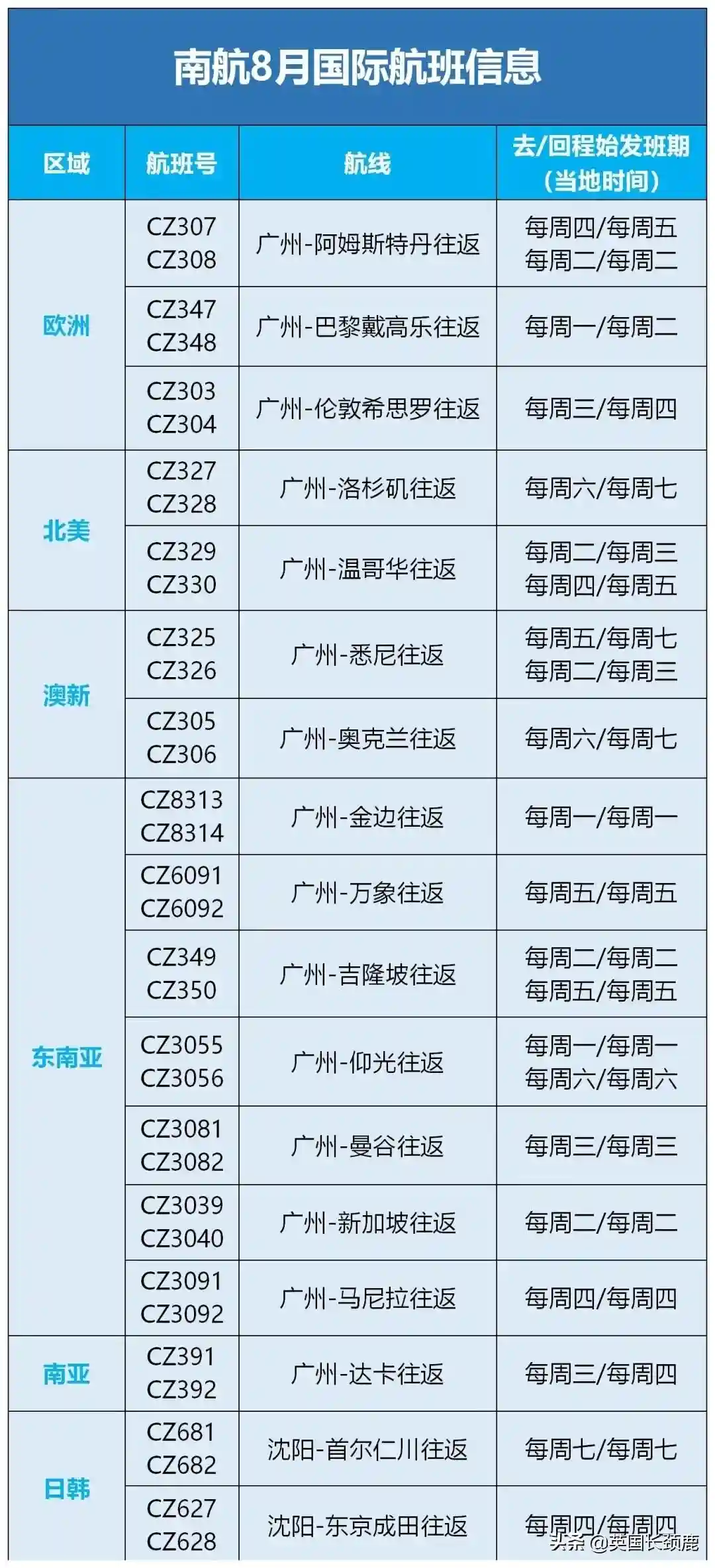 2020年7月27日(周一),南航官方公布了8月国际航班计划:南航每周可执行国际航线共计17条,具体航班计划如下(其中广州往返阿姆斯特丹等航线每周将执行2班往返)