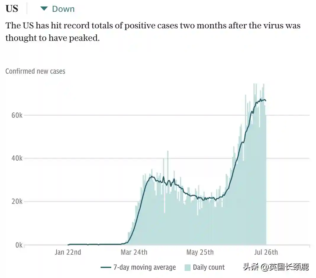 7月26日(周日),根据JohnsHopkinsUniversity的数据显示:美国单日新增确诊在24小时内再创记录——总共增加了55,187例。上一次最高记录还是在2周前的7月13日。