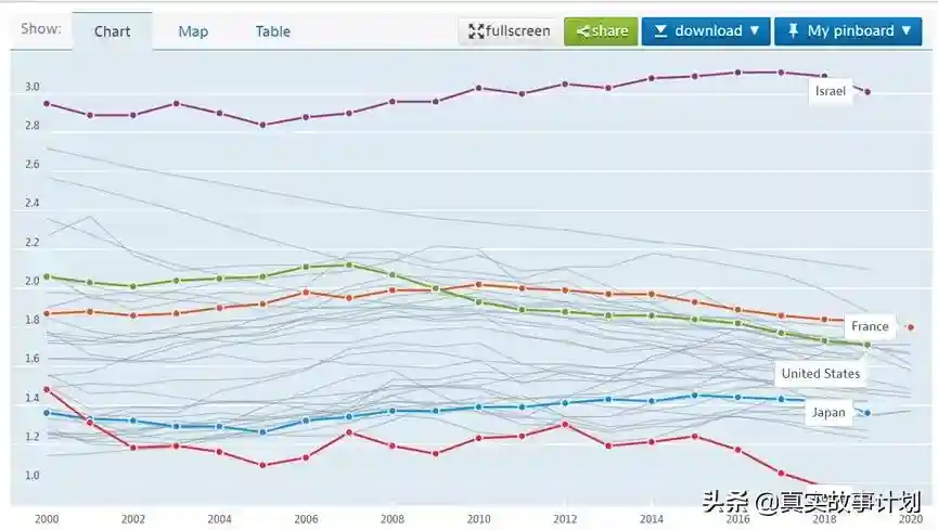 从1970年到2019年,美国总生育率从2.48降至1.70,日本从2.13降至1.36。1960年至今,OECD(经济合作与发展组织,由38个市场经济国家组成)总和生育率从3.2降至1.7。