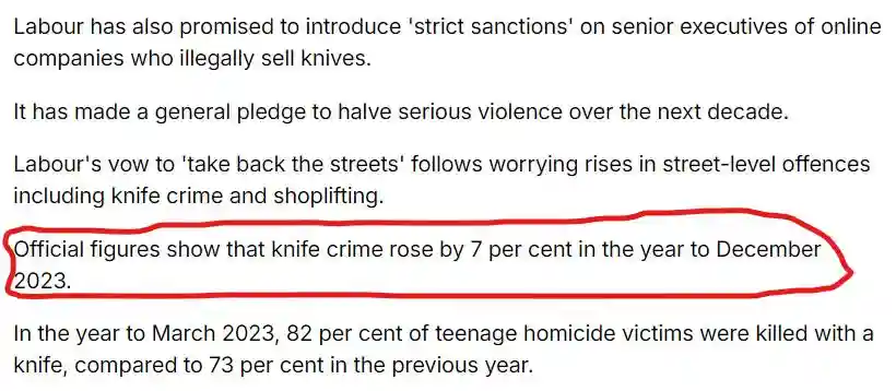 你自己想想啊,20cm的刀刃,反正很多菜刀、西瓜刀、水果刀、面包刀都算了。英国方面有人支持,有人反对,支持的人认为早该这么做了,因为这几年英国发生了很多持械伤人、抢劫的案件,每日邮报援引了英国官方的数据:2023年12月份,英国持刀犯罪率上升了7%,一年时间里的青少年凶杀案受害者,有82%都是被人持刀伤害的,之前的一年才73%。(下图)