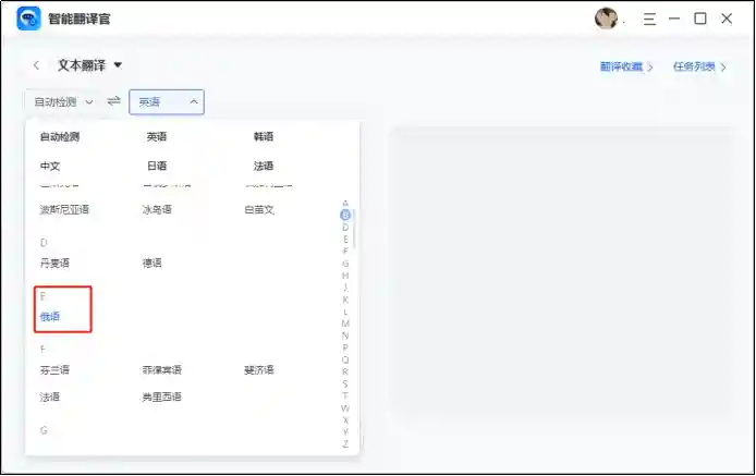 2、进入文本翻译界面,可以发现它支持着上百种语言的在线翻译,我们按照需求找到俄语就可以了。