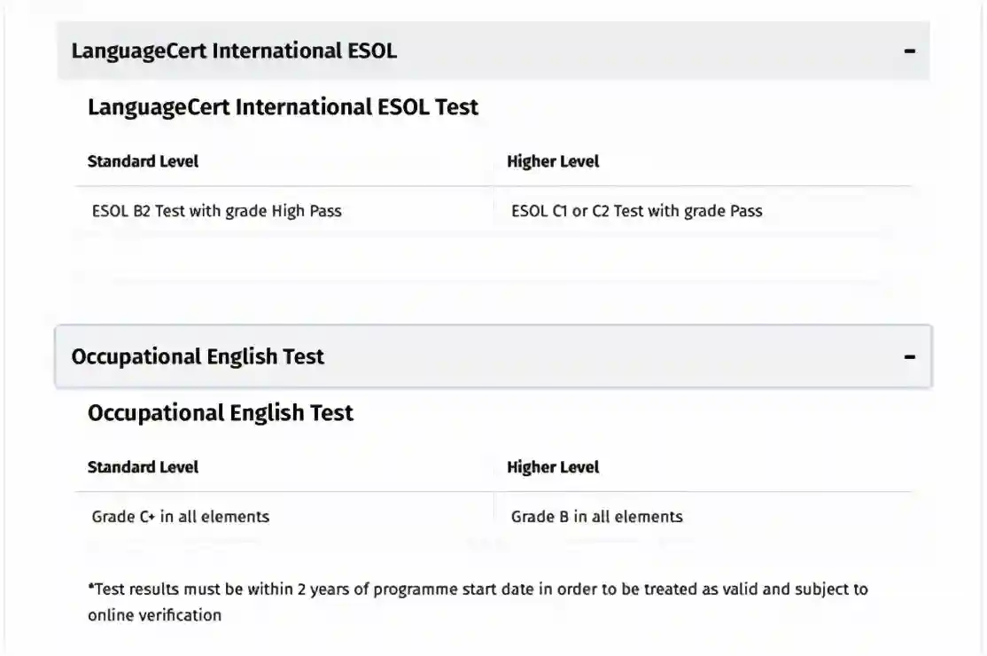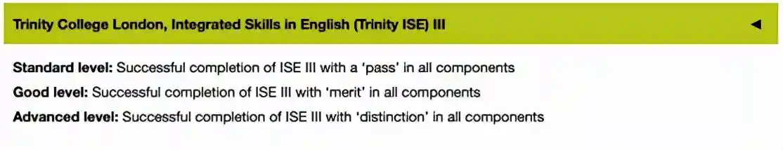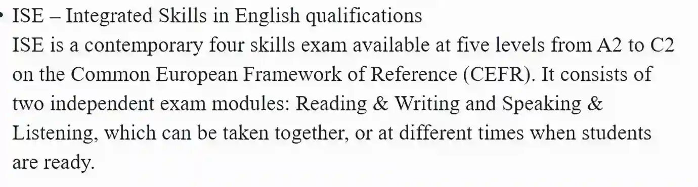 TrinityISE的考试(B1;B2;C1水平)也是被UKVI认可的SELF考试之一,所以可以用于签证申请。它的完整等级划分从A2到C2一共5等。