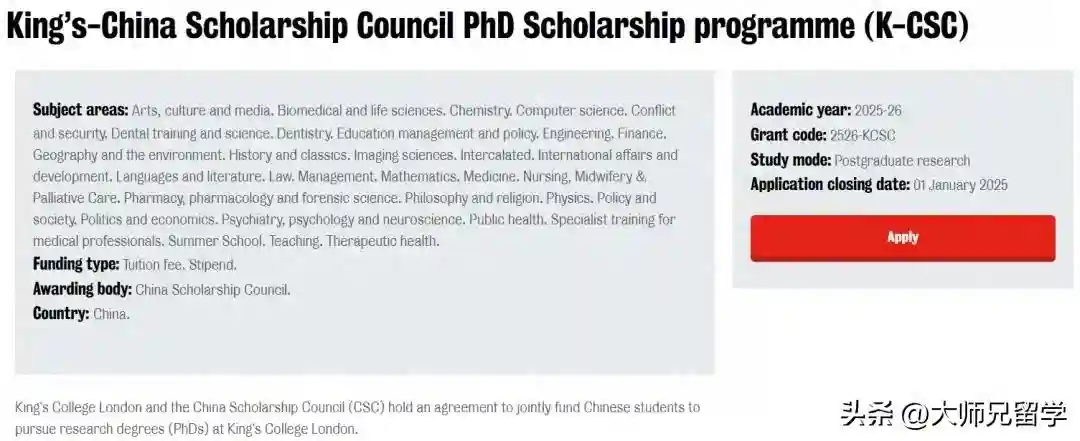 英国伦敦国王学院25Fall博士CSC奖学金开放申请