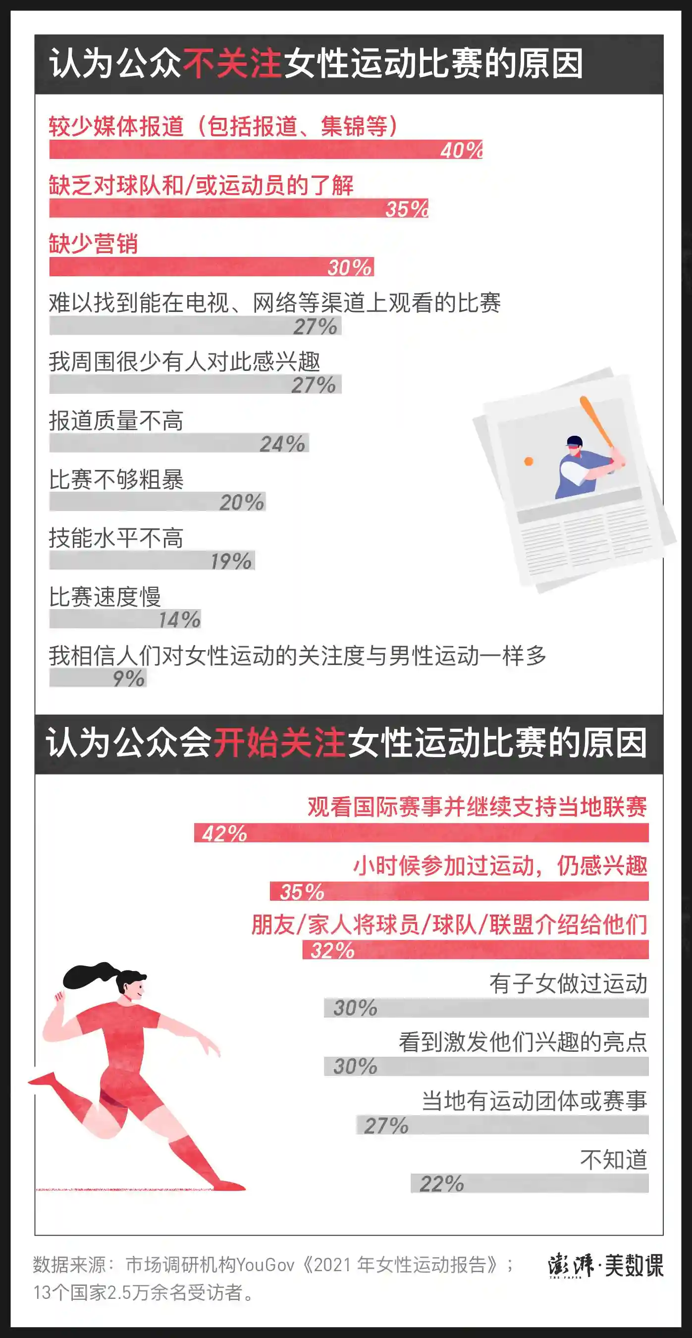 媒体曝光少现象,也出现在此次中国女足亚洲杯比赛的电视转播中。据悉,无论是中国女足击败越南队,晋级亚洲杯4强,亦或是逆转日本队进入决赛时,均没有电视转播。美国南加州大学和普渡大学学者在一项长达30年的研究中发现,在美国ESPN体育中心电视节目和洛杉矶当地三大电视台中,关于男性运动的报道数量远远超过女性运动,比如2019年,无论是在电视、在线或社交媒体上,超八成运动报道与男性有关,女性运动相关报道不足6%。