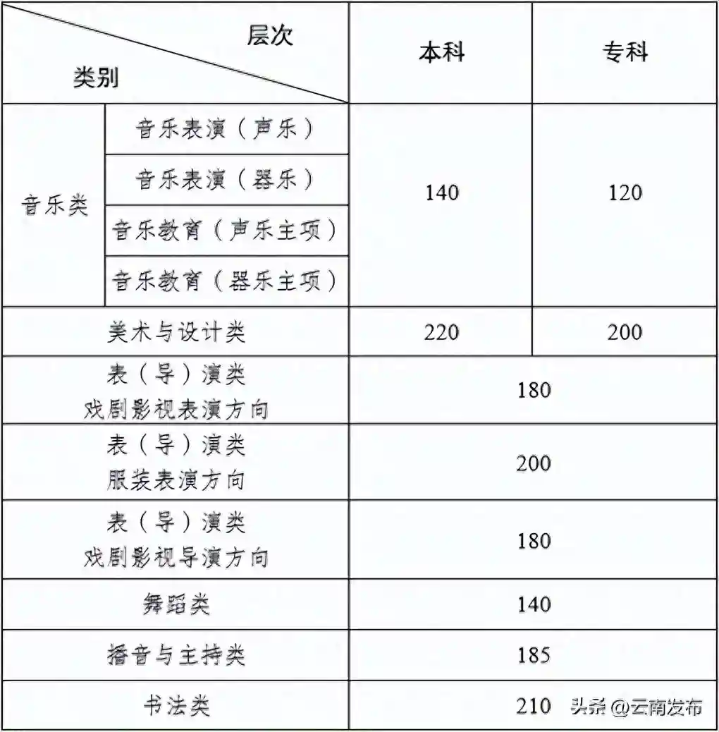 云南省2024年普通高校招生艺术类省级统考专业录取最低控制分数线