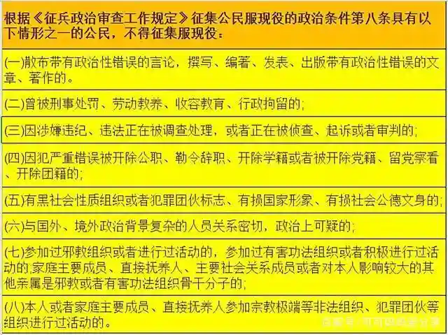 就是今年征兵工作的一些新变化和调整,我们应该事先制定计划。有的学生认为参军很简单,只要身体条件符合标准,愿意吃苦就行,但现实并非如此,参军不光对年龄和身体素质灯油要求,还需要政审合格。比如,下图中的8种情况,将无法通过政审,也就无法参军。