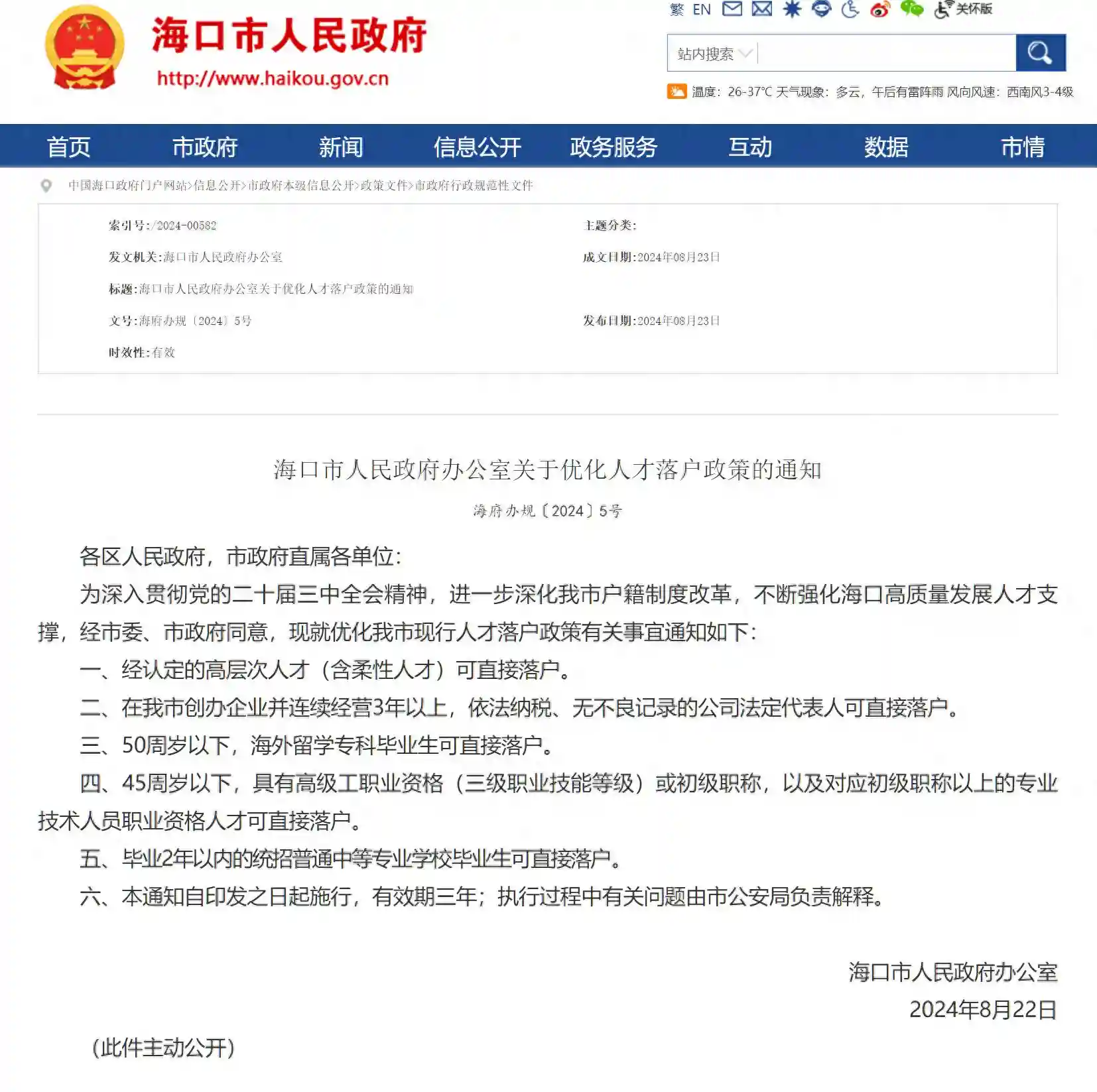 8月23日,海口市人民政府办公室发布《关于优化人才落户政策的通知》(以下简称《通知》),优化海口市现行人才落户政策,《通知》自印发之日起施行,有效期三年。