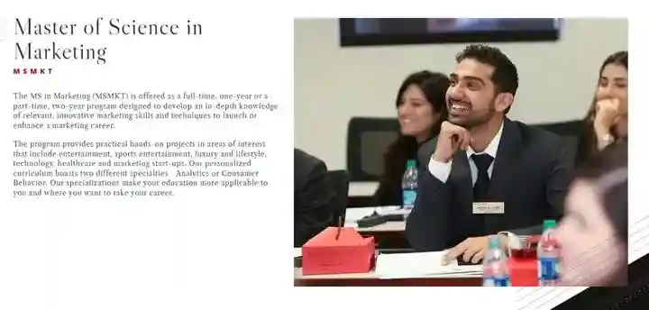 市场营销硕士项目开设在其商学院下,项目旨在帮助学生使用所学到的营销知识来解决各种规模的组织所面临的现实挑战,学生将通过该计划的密集课程,融合消费者行为,大数据,分析,新技术和说服心理学的见解,揭示当代营销的内部运作。