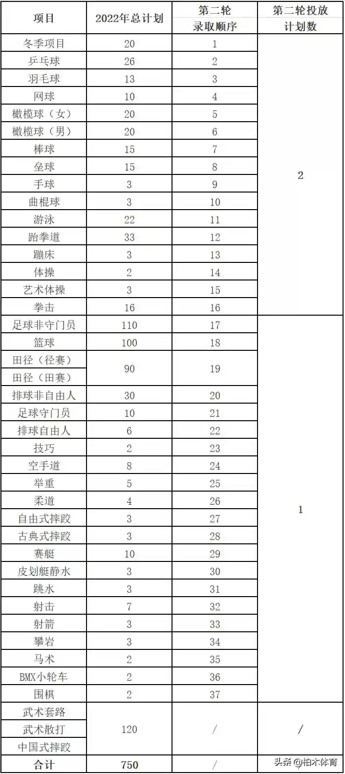 运动训练专业630名,武术与民族传统体育专业120名,以下为分项目招生计划表