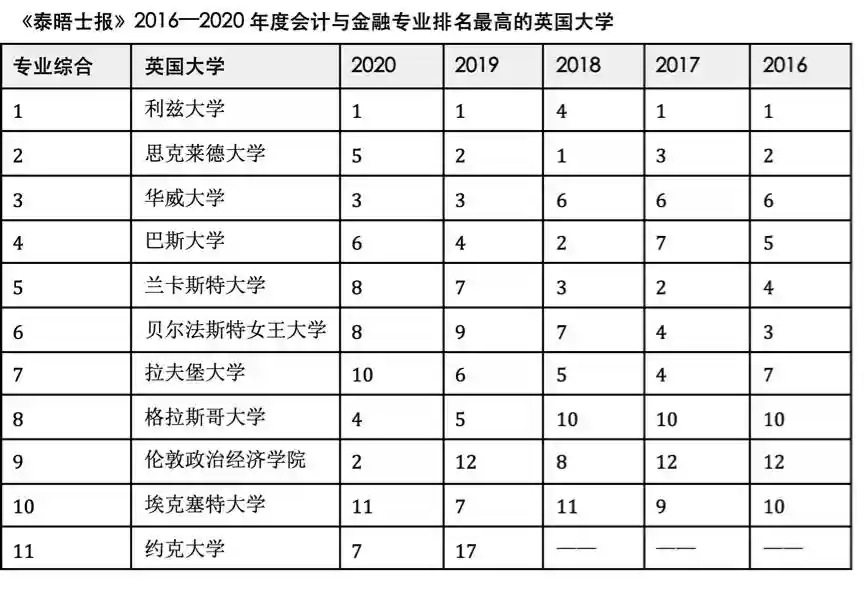 由此可以列出在《泰晤士报》会计与金融专业排名最高的11所大学,其中有8所英国大学连续5年位列全英前10名,它们分别是: