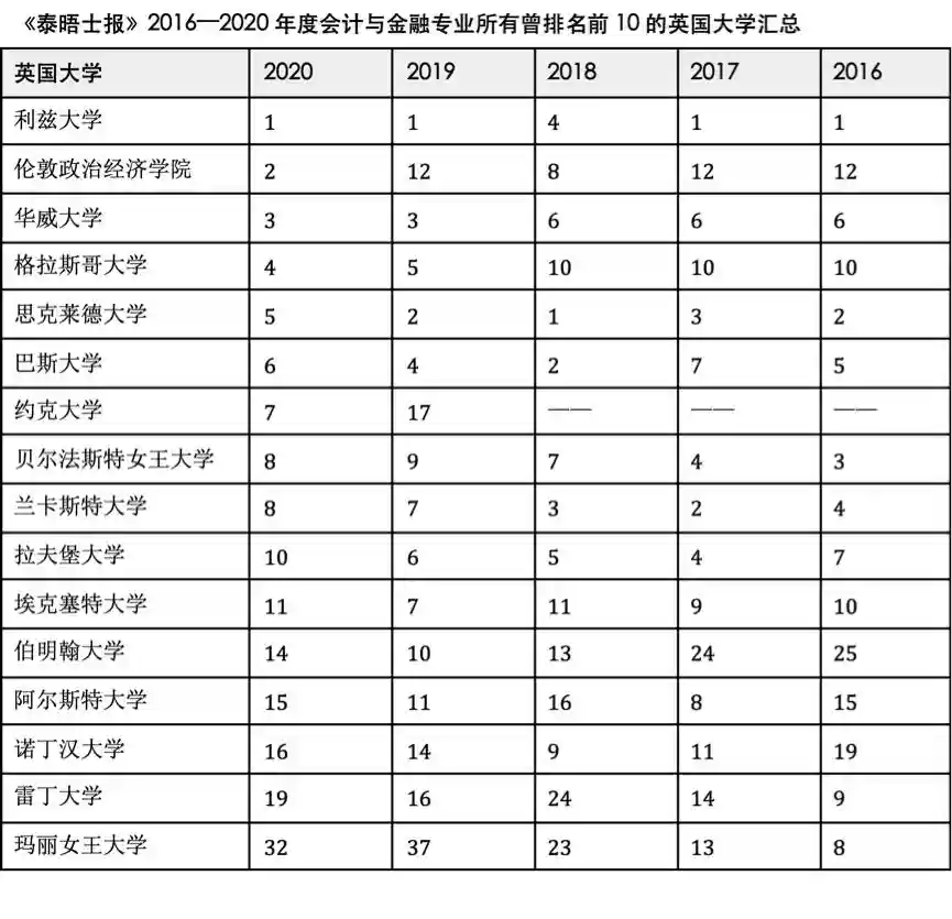 我汇总了《泰晤士报》(Times)2016—2020年度英国大学会计与金融专业排名,列出了最近5年中,所有曾进入该专业全英前10名的英国大学。