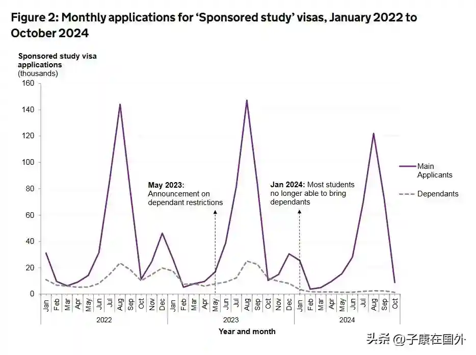 留学政策的重大变化,不允许带家属陪读自2024年1月起,国际学生除研究型硕士和博士课程外,不再允许携带依赖者。该政策直接影响了申请者签证的申请数量。学生签证申请人同比下降16%2024年1月至10月的学生签证主申请人数量为359,600例,同比减少16%。2023年5月前:申请量保持正常的季节性波动,高峰期每月达到约14万例。2024年1月政策生效后:绝大部分学生不再允许携带家属,这对主申请人产生间接影响。2024年1月至10月的总申请量为359,600例,同比减少16%。学生签证陪读签证申请同比下降85%同期依赖者签证数量仅为19,100例,同比减少85%。