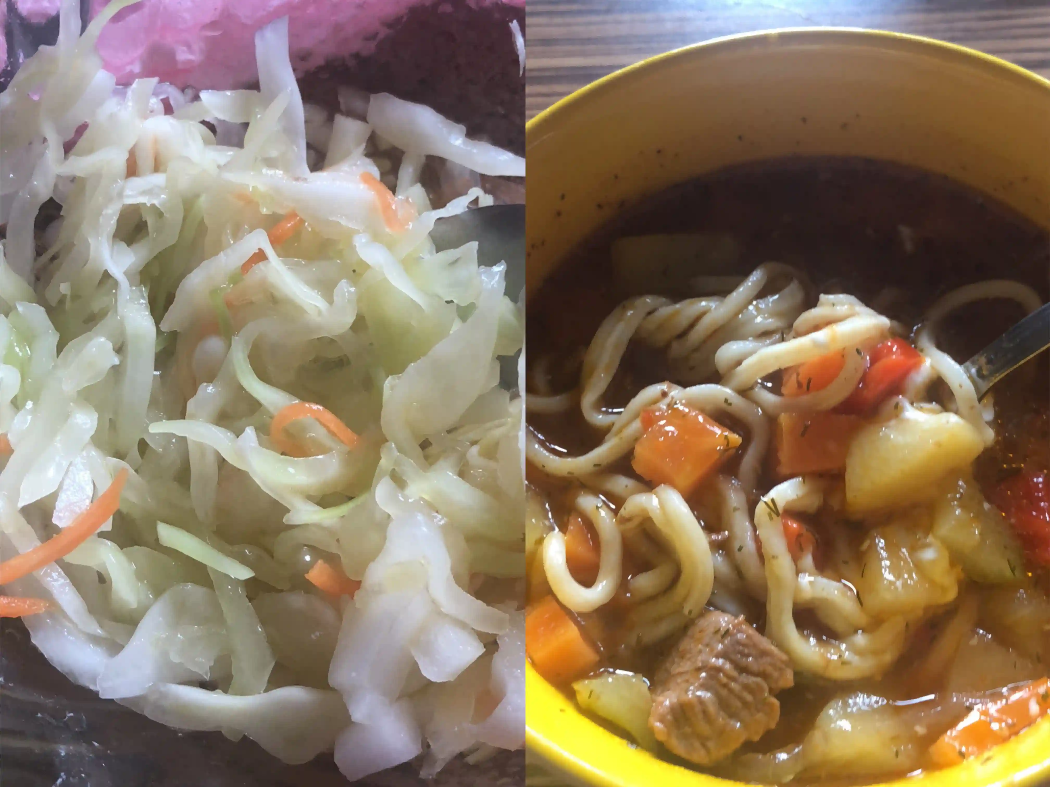 由于早上起得早,还没到中午我们饥肠辘辘,于是我们在公路旁的КАФЕ(咖啡馆)用午餐,此咖啡馆并不是专门喝咖啡的而是类似国内的小餐馆提供家常简餐的地方。不得不说即使是简餐也是充满着仪式感,第一道菜是冷盘,也就是沙拉之类。第二道菜就是汤了,最出名的就是红菜汤。第三道菜就是主食了,比如土豆泥配上牛肉猪肉鸡肉炖菜。还有就是最出名的大列巴面包了。最后一道菜就是甜品,可以是冰淇淋或者是提拉米苏小蛋糕。虽然俄餐分量不多,但是营养搭配均衡,能够满足热量的需要。有些人觉得好吃而有些人吃不惯拿出了自己从国内带的小酱菜和辣椒酱,人以食为天,中国人在国外可能语言会变习惯会变但是自己的胃是永远不会变的~