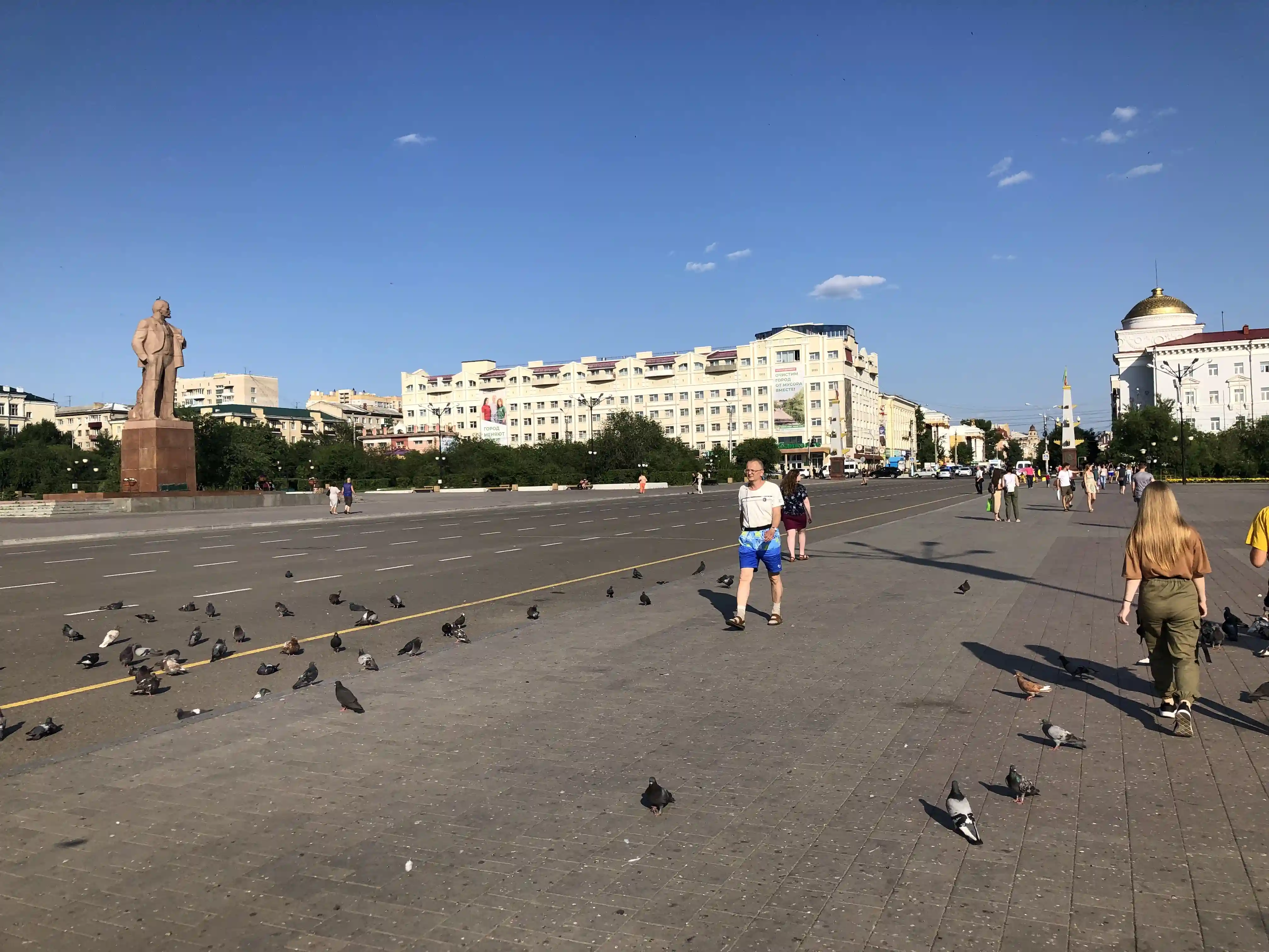 进入赤塔我们首站就来到了列宁广场,俄罗斯几乎每个城市都有列宁雕像,雕像所在的广场就叫列宁广场,所在的大街就叫做列宁大街,可以这么说哪里有列宁雕像哪里就是市中心了。俄罗斯的鸽子很多还不怕人,落在我们身上我们争先拿出手机拍照,可惜的是我们没有准备面包让他们大饱口福了。