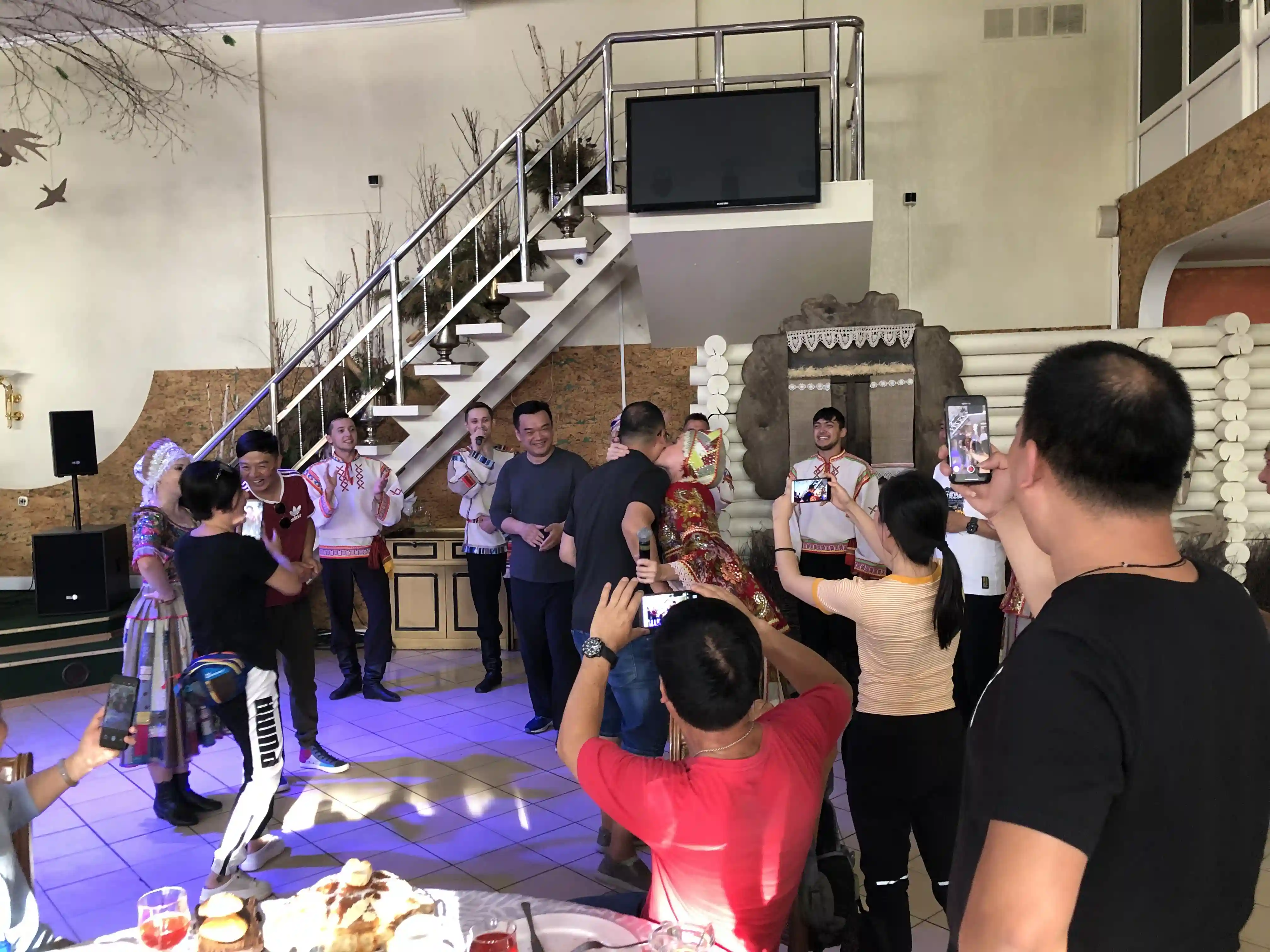 今天我们才算是第一次领略到俄罗斯战斗民族风情,我们为各位老司机们准备了丰盛的欢迎宴,俄罗斯迎接尊贵的客人就是面包和盐了,每个人取一小块面包蘸盐吃。最吸引人的就是俄罗斯美女了,俄罗斯民族是一个能歌善舞的民族,众多男老司机们都纷纷上前互动,俄罗斯姑娘也是大胆当着别人老婆的面就亲脸蛋,老司机的爱人们也不管了,大声做笑合不拢嘴!