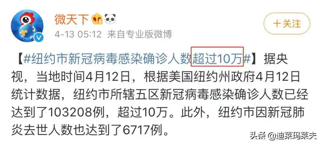 今天,美国抗疫前线又传来了令人揪心的消息——当地时间12日,纽约市的新冠肺炎确诊病例已累计超过10万例。