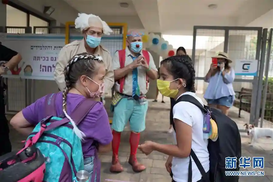 这是9月1日在以色列中部城市特拉维夫一所小学外拍摄的佩戴口罩的学生。以色列中小学的新学年于9月1日开始,低年级(1至4年级)进行小班教学,中高年级(5至12年级)则主要是远程在线学习。新华社/基尼图片社