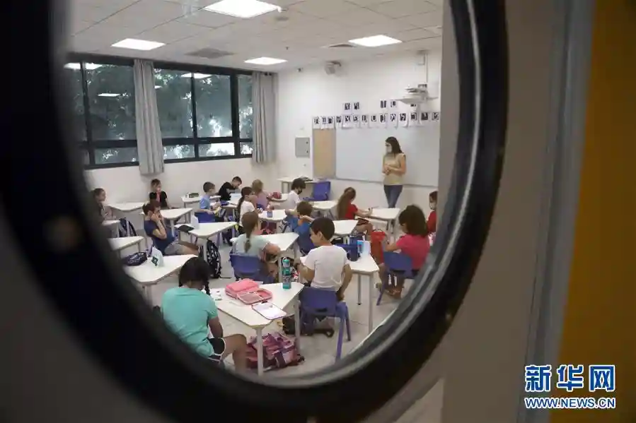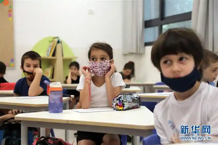 这是9月1日在以色列中部城市特拉维夫一所小学的教室内拍摄的佩戴口罩的学生。以色列中小学的新学年于9月1日开始,低年级(1至4年级)进行小班教学,中高年级(5至12年级)则主要是远程在线学习。新华社/基尼图片社