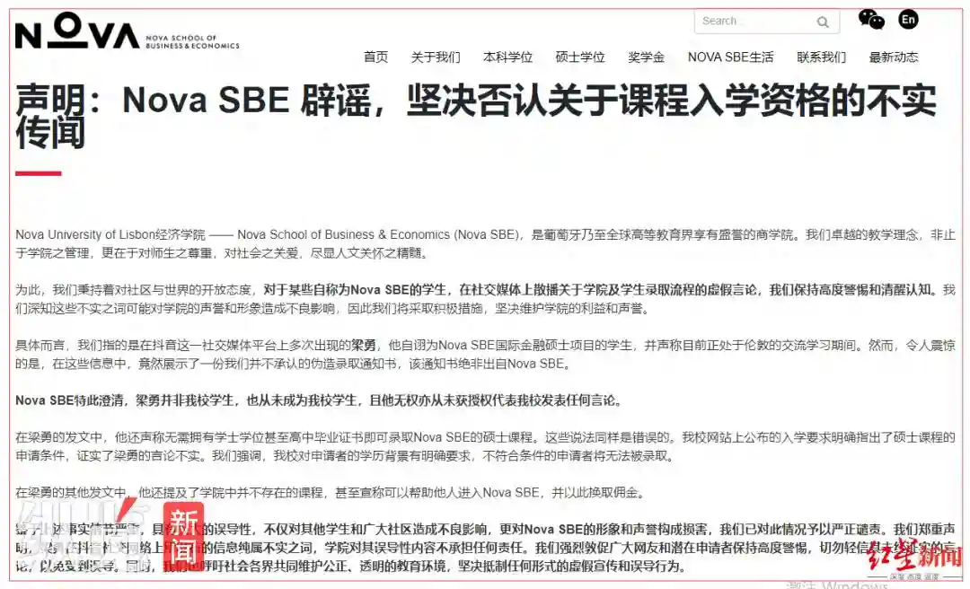 声明还指出,在梁勇的其他发文中,他还提及了学院中并不存在的课程,甚至宣称可以帮助他人进入NovaSBE,并以此换取佣金。鉴于上述事实情节严重,具有极大的误导性,不仅对其他学生和广大社区造成不良影响,更对NovaSBE的形象和声誉构成损害,我们已对此情况予以严正谴责。NovaSBE建议广大网友和潜在申请者保持高度警惕,切勿轻信其未经证实的言论,以免受到误导。