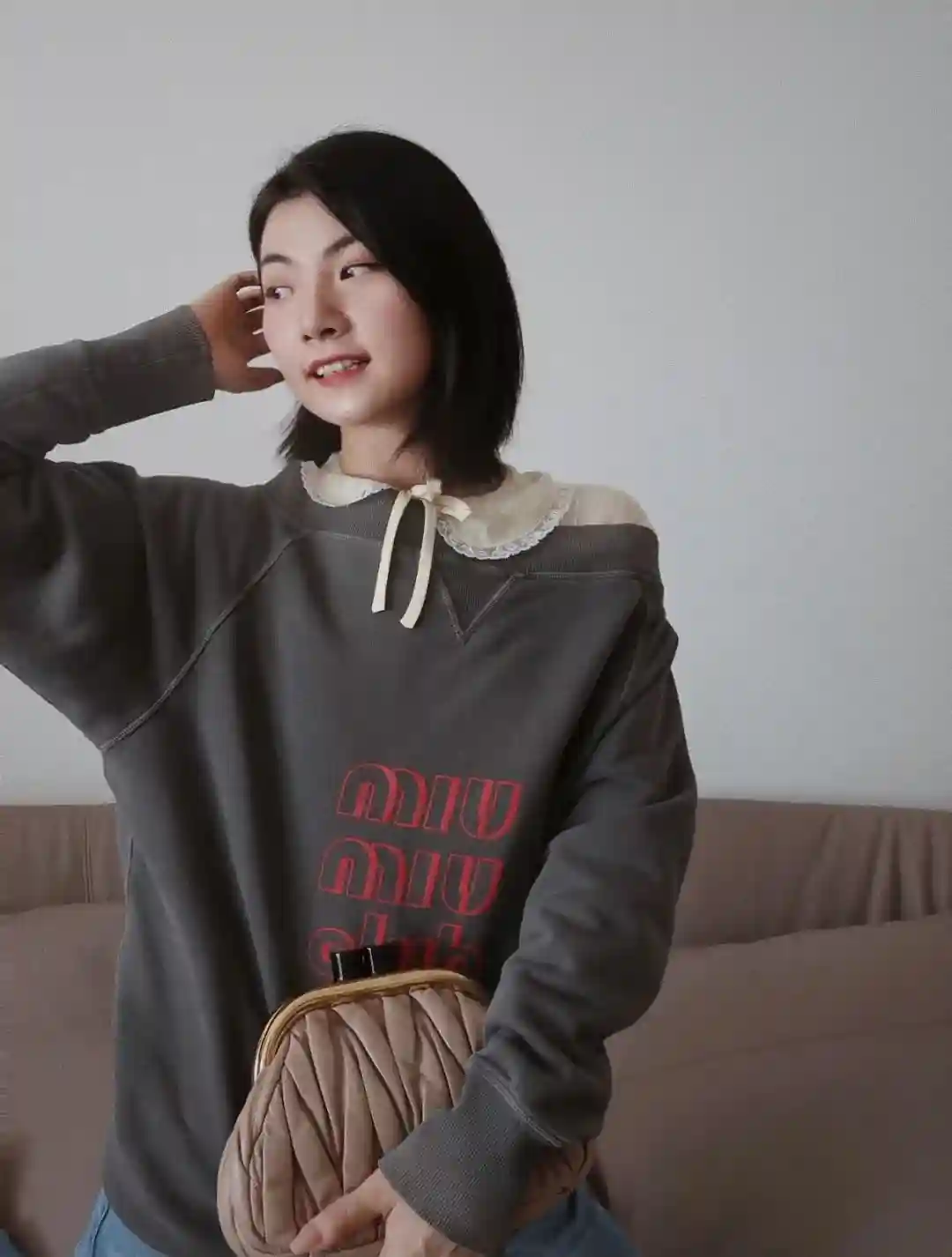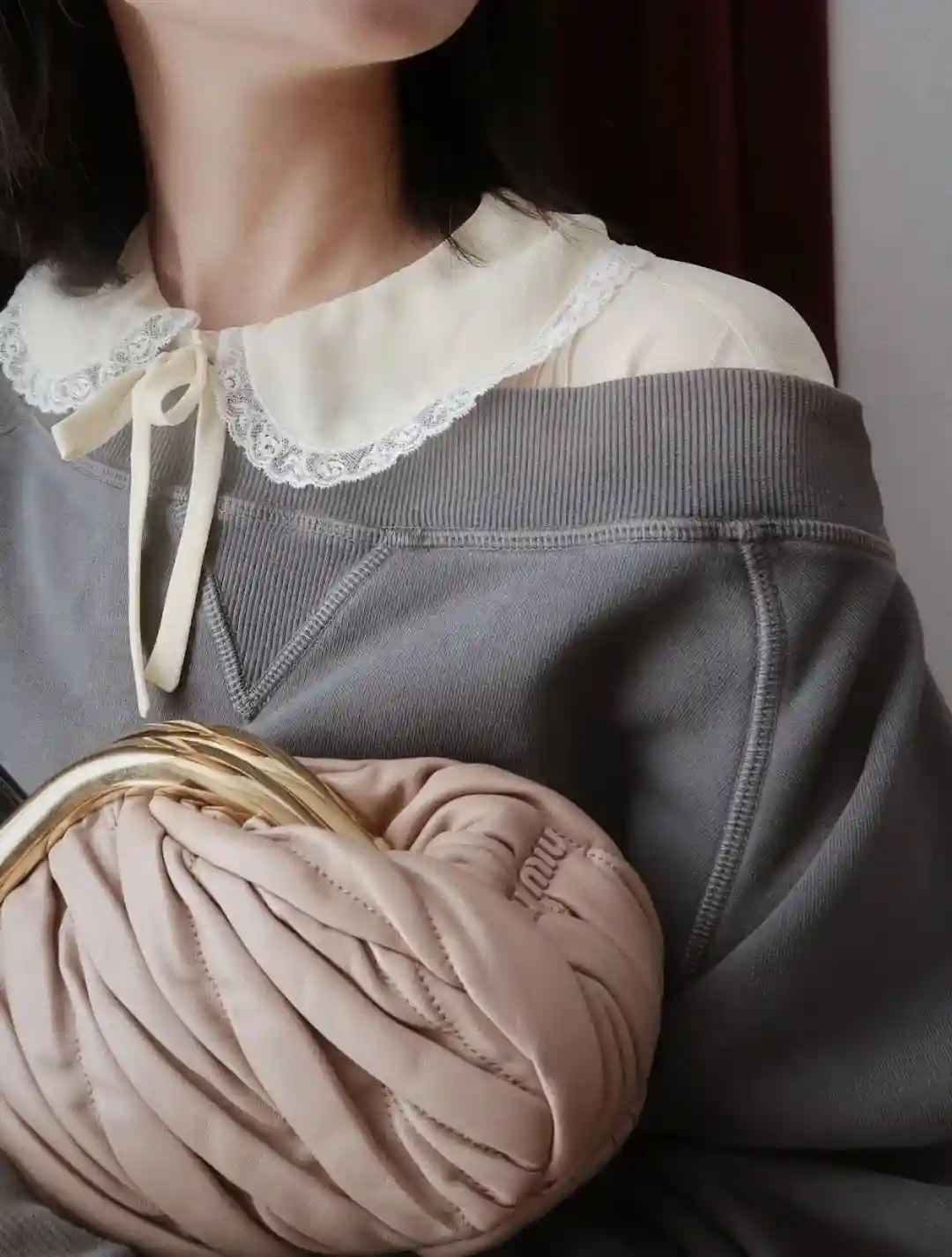 我选择的内搭是一件米黄色的丝质衬衫,充满着MiuMiugirl的特点,小圆领、丝带领结、蕾丝点缀优雅中不失俏皮。而与运动风的卫衣混搭,效果反倒很有趣。