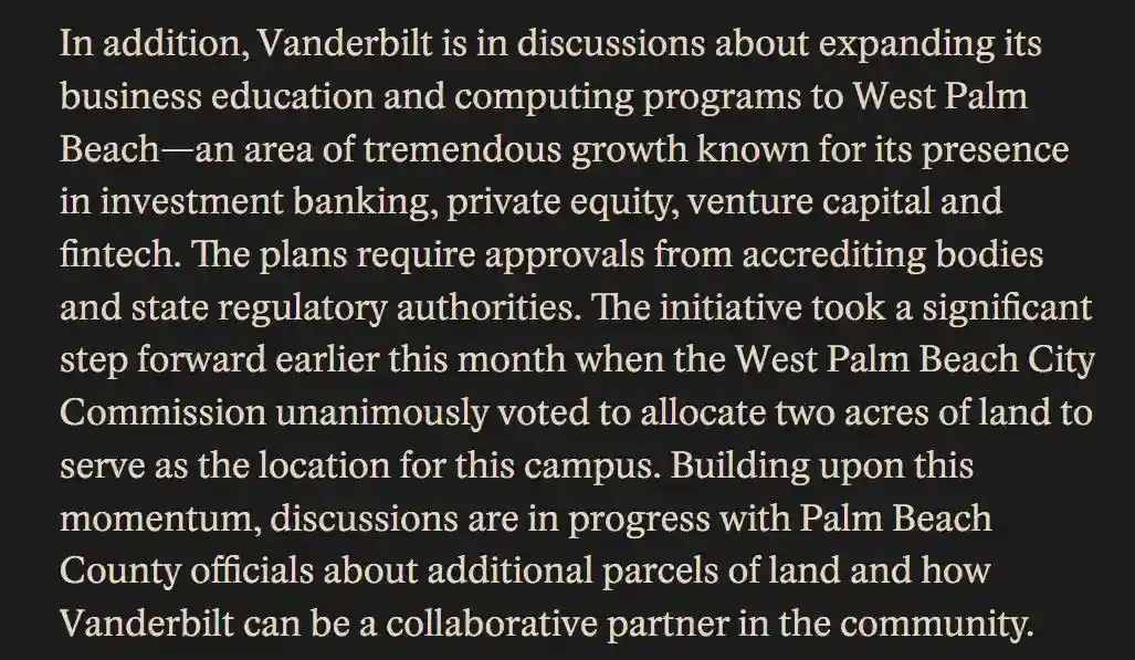 范德堡预计投资5.2亿美元,在佛罗里达州的西棕榈滩建造一个提供商科和计算机教育的研究生院。最早可能于2026年秋季开放招生。