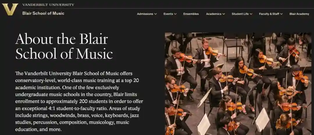 Blair音乐学院:是美本Top20里为数不多的,专门招收本科生的音乐学院之一。该学院每年招生人数限制在200名左右,以保持1:4的优越师生比例。
