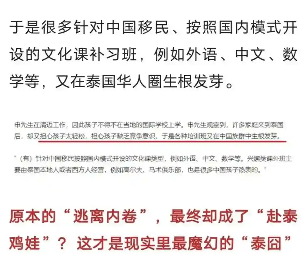 这些高考培训机构也是国内留学中介开的,他们从办理国籍、高考培训、回国面试等一条龙服务,家长和孩子只要跟着他们走可以了。而且为了应对我国高校的资料审核和面试,他们的学习内容主要是拼读与写作、数学、戏剧、音乐、体育、美术6门基础学科,平时就爬爬山,游游泳,2年过后拿着在泰国“国际学校”的优秀证明资料,参加一个汉语水平考试,就能够轻松入读清北等985名校了。